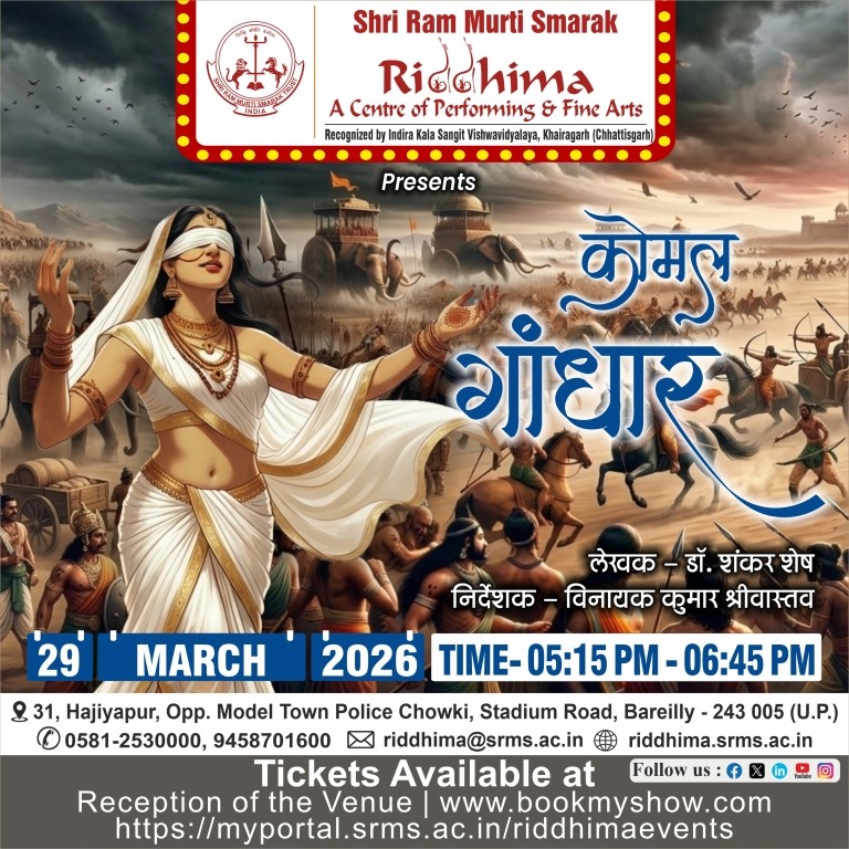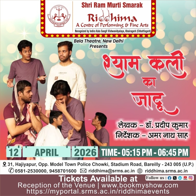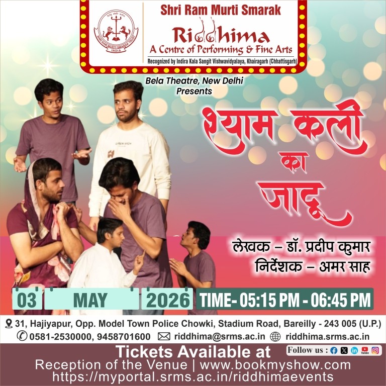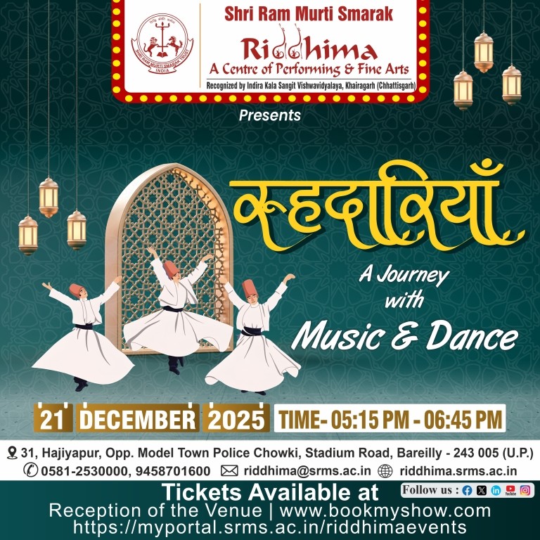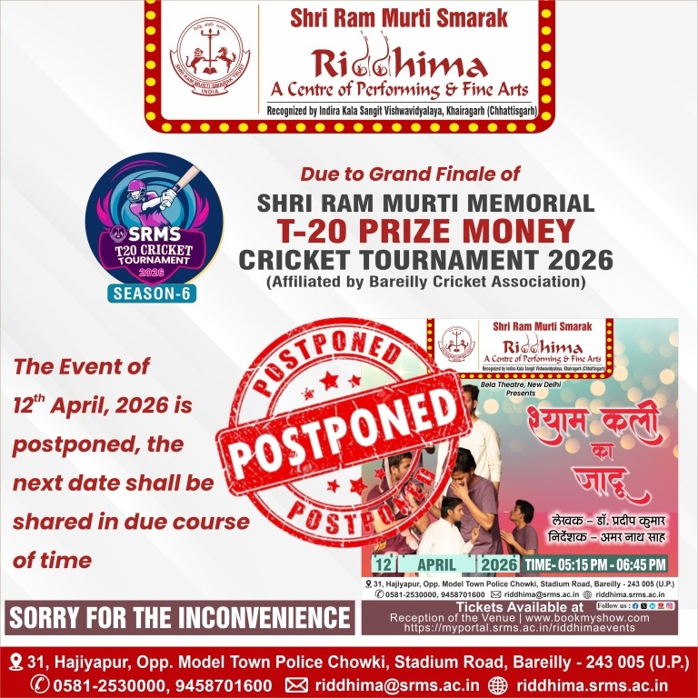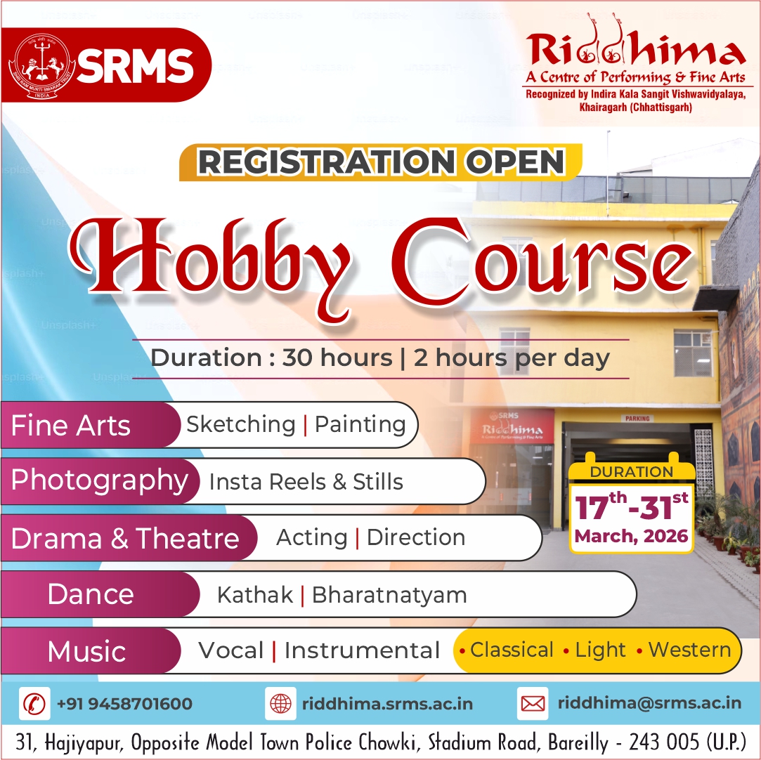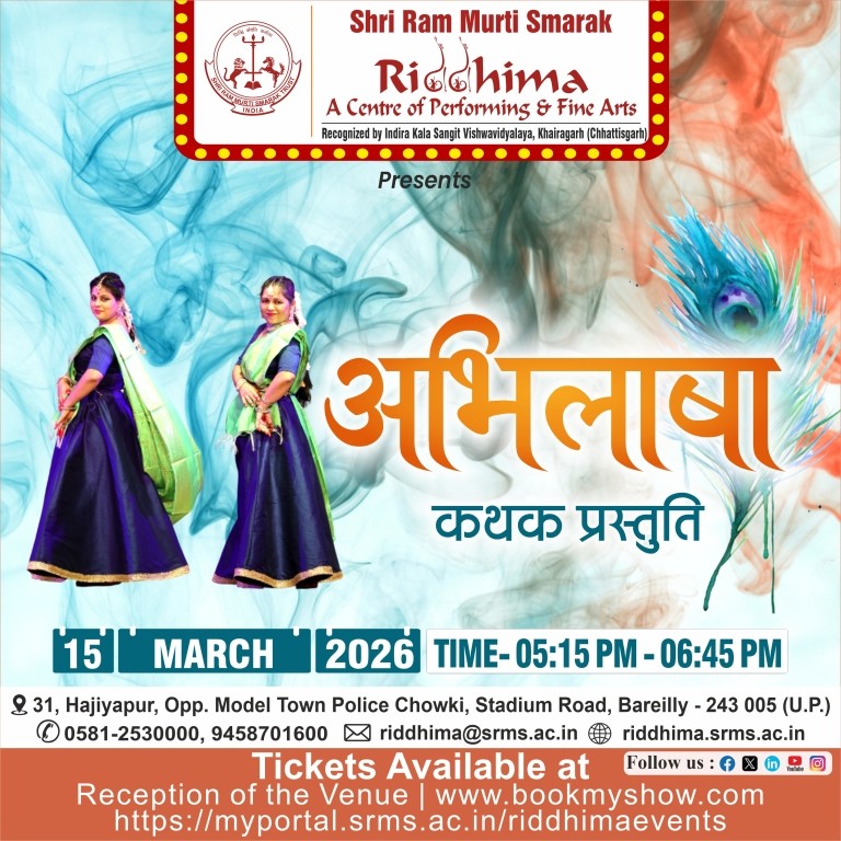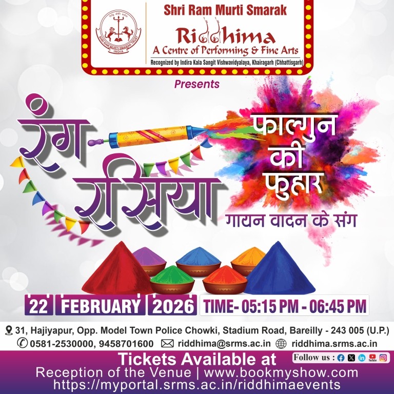 SRMS Riddhima – A Center for Performing and Fine Arts, is a tribute to Shri Ram Murti Ji, for his special inclination towards art and culture, by Shri Ram Murti Smarak Trust. The centre is affiliated to Indira Kala Sangit Vishwavidyalay (Khairagarh), Chattishgarh. The main objective of this Centre is to preserve the cultural heritage of Ganga Jamuni tradition of Bareilly, for the revitalization in the field of art and culture, as well as to attract the youth towards classical dance, classical music (Vocal and Instrumental), fine arts, Drama and theater.