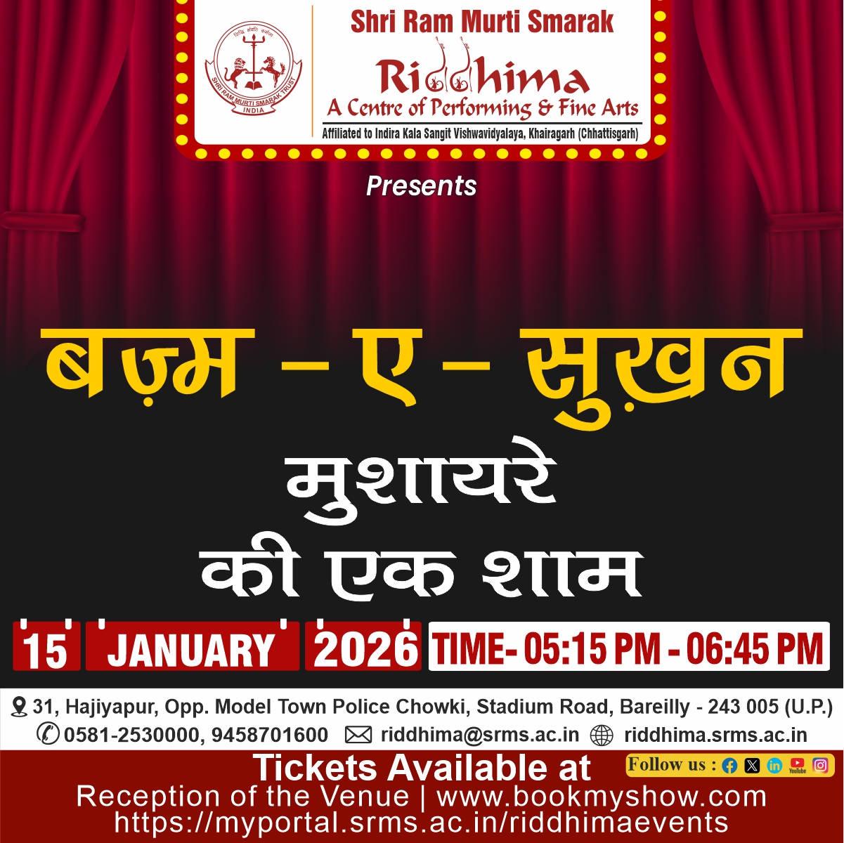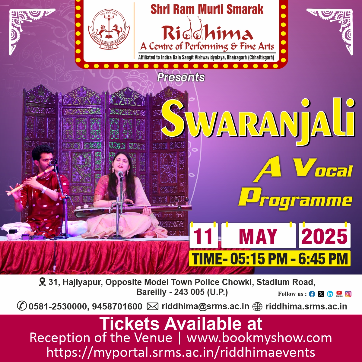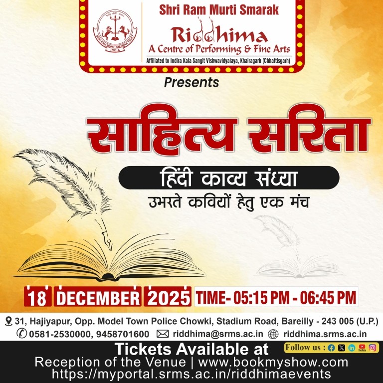 SRMS Riddhima– A Center for Performing and Fine Arts,is a tribute to Shri Ram Murti Ji, for his special inclination towards art and culture, by Shri Ram Murti Smarak Trust promoting the Ganga Jamuni Tradition.